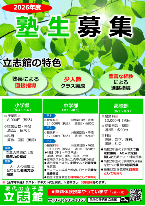 立志館では、2026年度新塾生(小4〜高3)を募集しています。